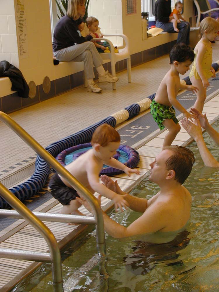 At swimming class, we're blowing bubbles, going under water and starting to paddle